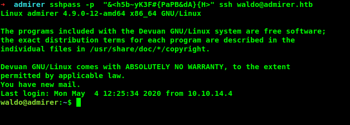 waldo@admirer:~/newpath$ listening on [any] 4444 ...