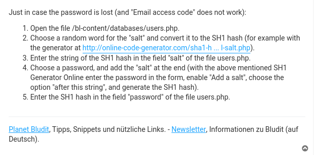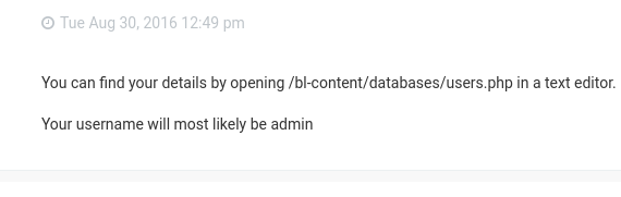 | Reseting password bludit | https://forum.bludit.org/viewtopic.php?t=767 |
