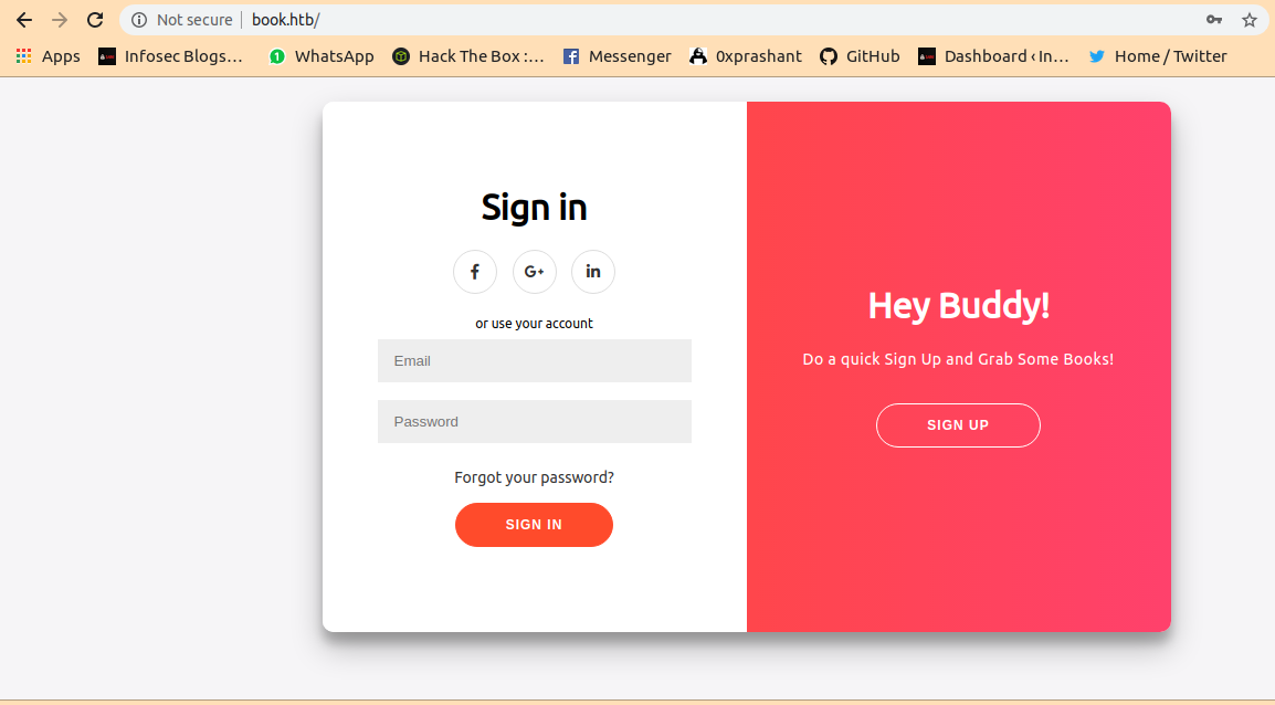 i Fired up the burp and captured the sign up request with name : admin email : admin@book.htb password : admin
