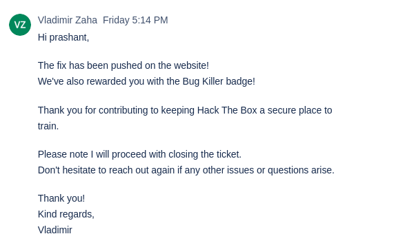 | Reward | A Bug Killer badge on my HackTheBox profile |