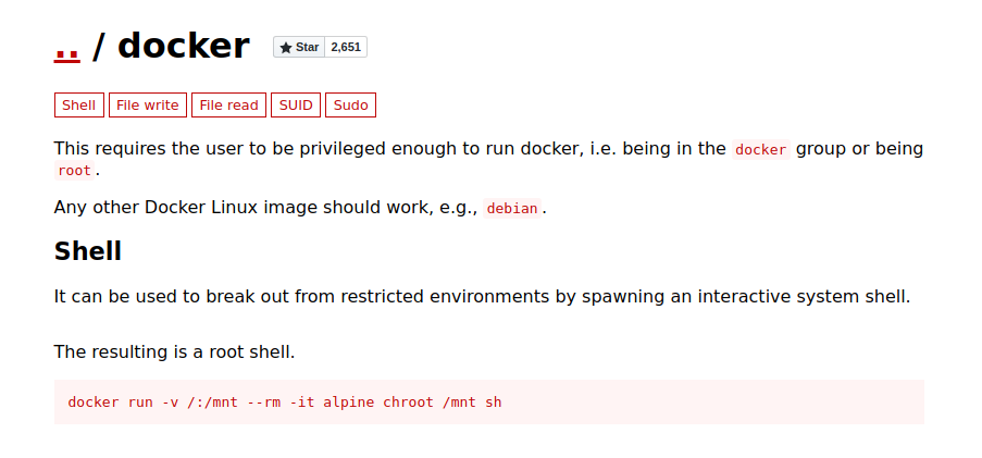 | Docker | https://gtfobins.github.io/gtfobins/docker/ |