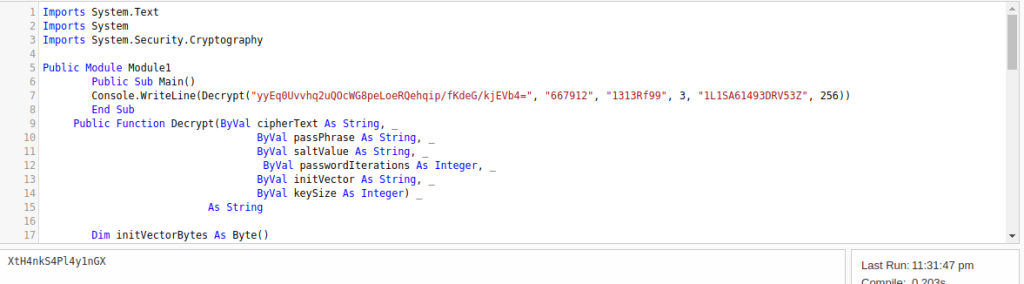return string.IsNullOrEmpty(EncryptedString) ? string.Empty : CR.RD(EncryptedString, "667912", "1313Rf99", 3, "1L1SA61493DRV53Z", 256);